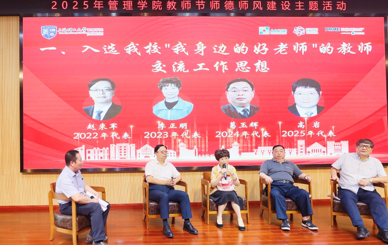 活动邀请了2022年至2025年期间入选学校“我身边的好老师”优秀教师师德师风故事的四位教师代表——赵来军、李正明、葛玉辉、高岩,以圆桌论坛形式分享他们的从教理念与育人经验。在“育人经验分享”环节,五位优秀教师代表讲述了育人实践中的点滴故事与深刻体悟。贺莉在讲话中表示,管理学院立足新时代教师队伍建设要求,积极营造尊师重教的良好氛围,涌现出一批师德高尚的教师代表并对全体教师提出工作要求。全体教师在蒲莹莹的带领下,共同诵读《新时代上海高校教师职业行为十项准则》。此次活动为学院师德师风建设拉开精彩序幕,营造了良好的育人氛围。